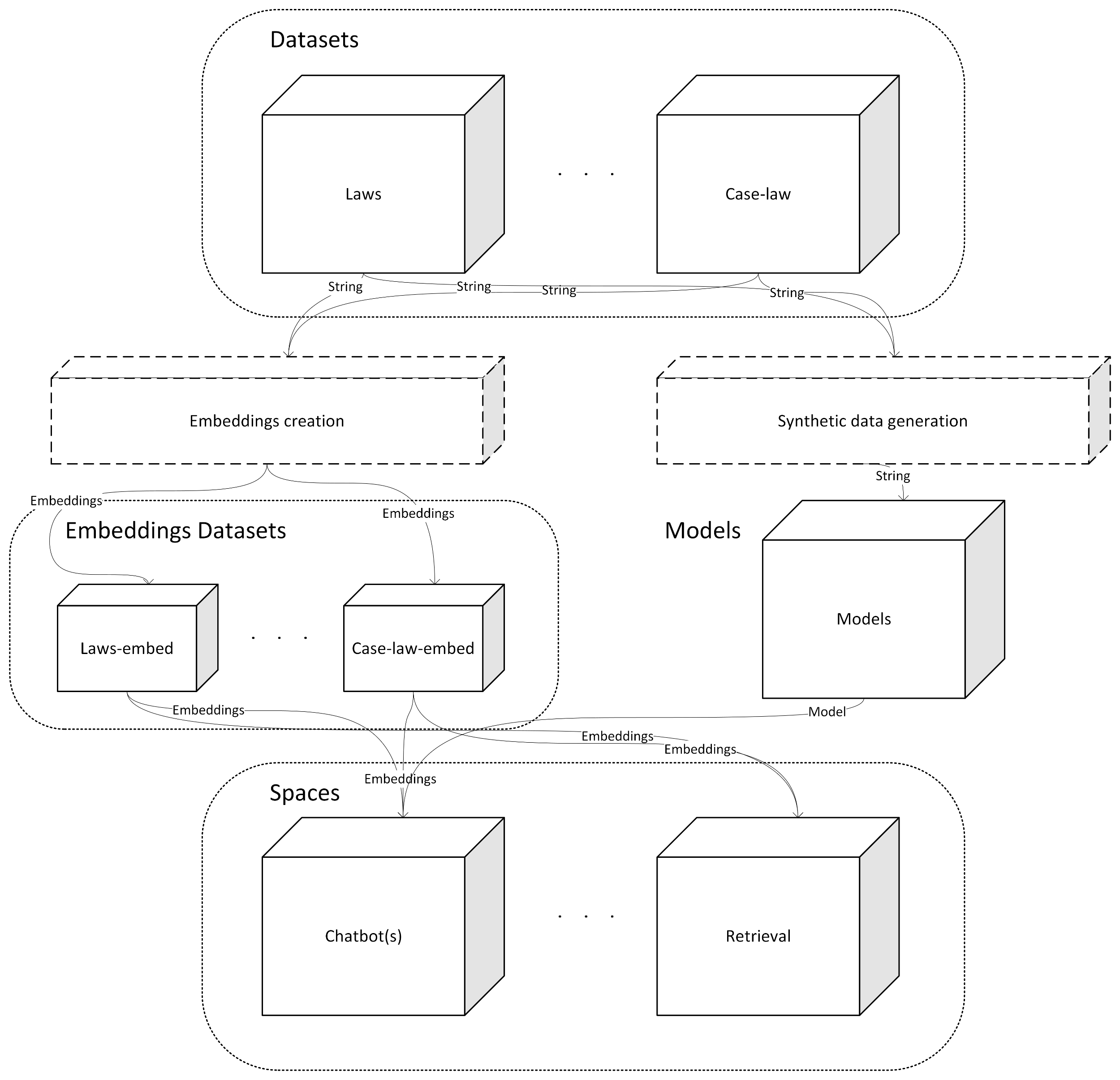 In order to simplify the deployment of the organization's various tools, we propose a simple architecture in which datasets containing the various legal and contractual texts are doubled by datasets containing embeddings for different models, to enable simplified index creation for Spaces initialization and the provision of vector data for the GPU-poor. A simplified representation might look like this: